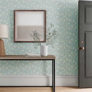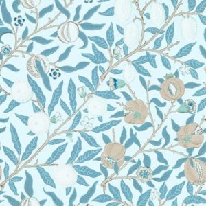 Lekkert tapet fra designeren William Morris med rolig blomstermønster i duse blåfarger.