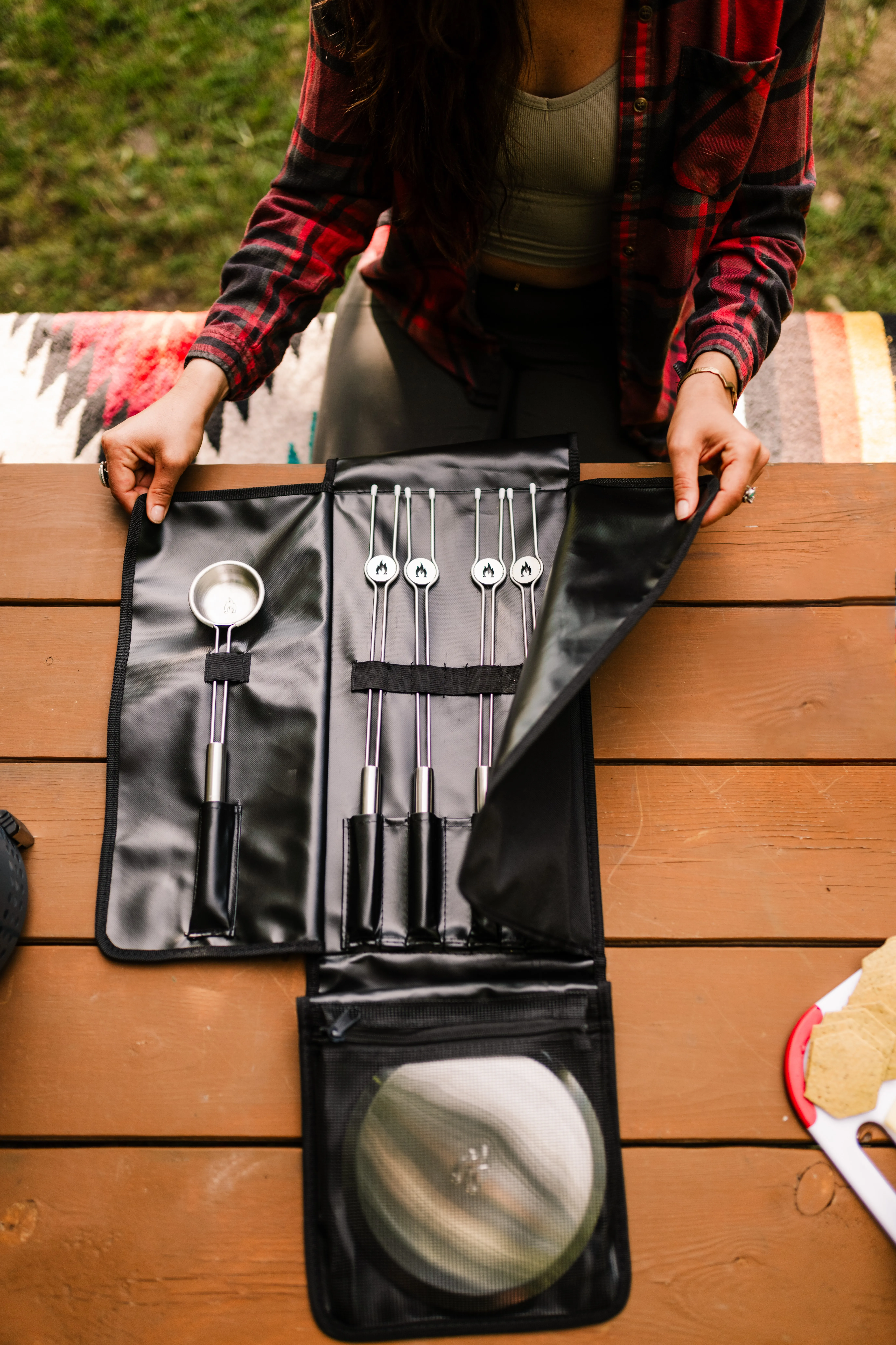 Fire grillpinner som er perfekte for marsmallows, smoores, eller pølse grilling i alle settinger, støtter til grill pinnene så ikke tuppene griser til bordet.