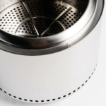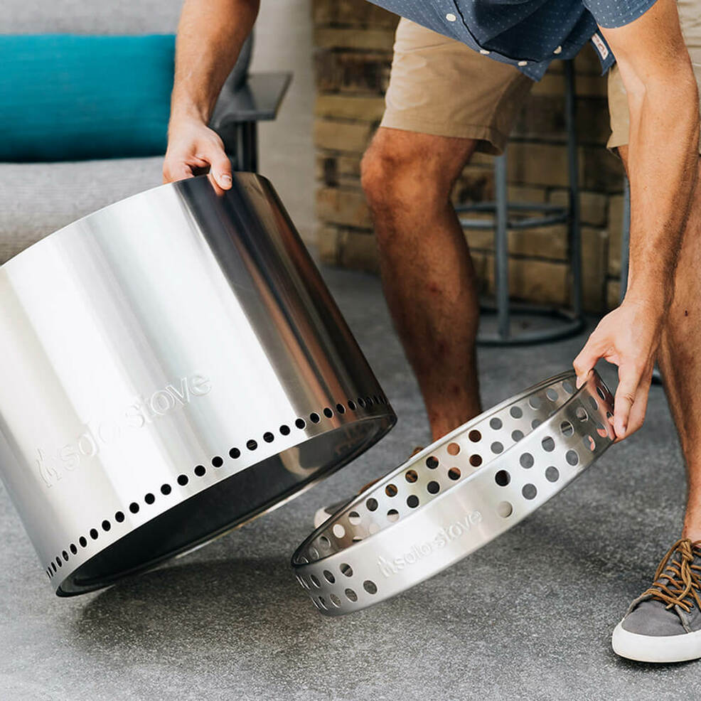 Et gjenkjennbart Solo Stove-produkt. Den rene, minimale, todelte gnistfangeren gir en ekstra grad av sikkerhet og trygghet. Den hjelper til med å forhindre gnister å sprute ut av bålpanna. Så det er trygt for barn og dyr å være rundt når du fyrer.