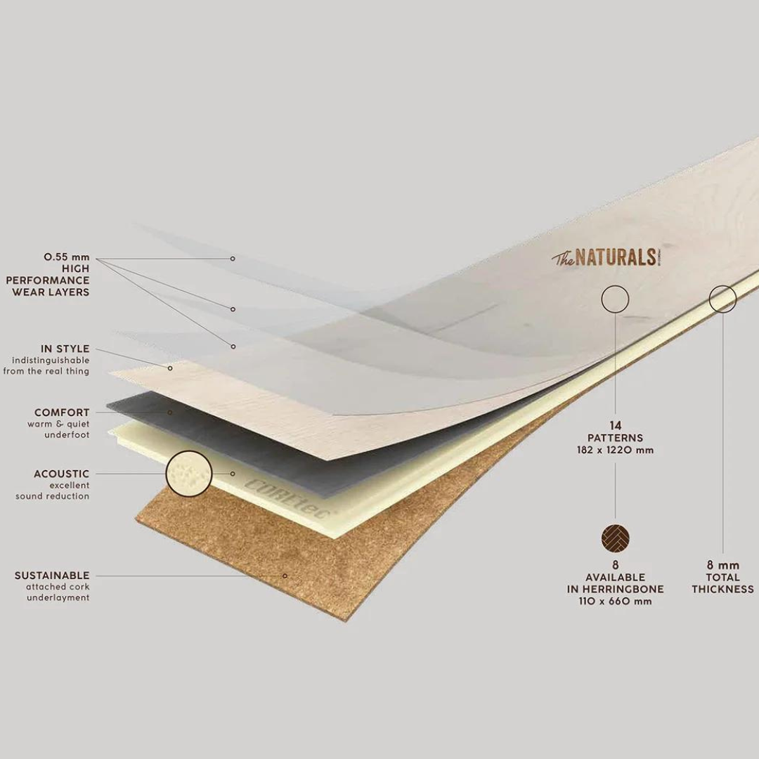 Slående vakre, ekstra miljøvennlige gulv med en ekstrem slitestyrke. (Industriell klassifisering) COREtec® er vårt premium vinylprodukt med spesialutviklet mellomsjikt for ekstra myk og behagelig gangkomfort. Baksiden i fleksibel natur kork gir COREtec® gulvene en ekstra god lyddemping både i og mellom ulike rom.