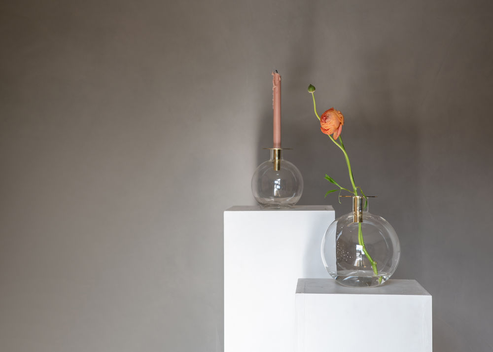 Top vase, laget av munnblåst glass og gullfarget metall. En enkel men dekorativ innredninsgdetalj som fungerer både som en vase for enkle snittblomster og som en lysestake for et kronelys. Den gullfargede delen er avtagbar.