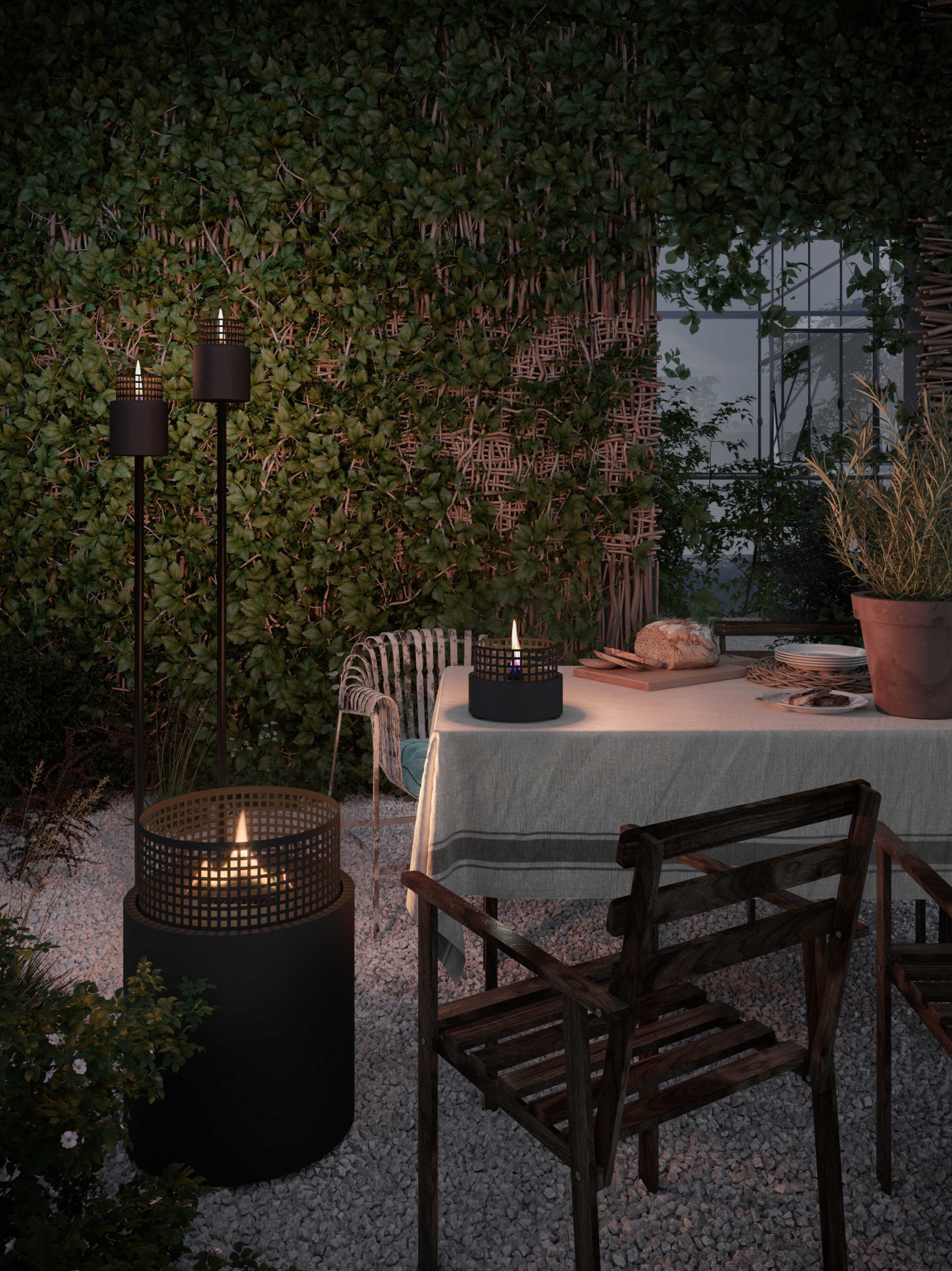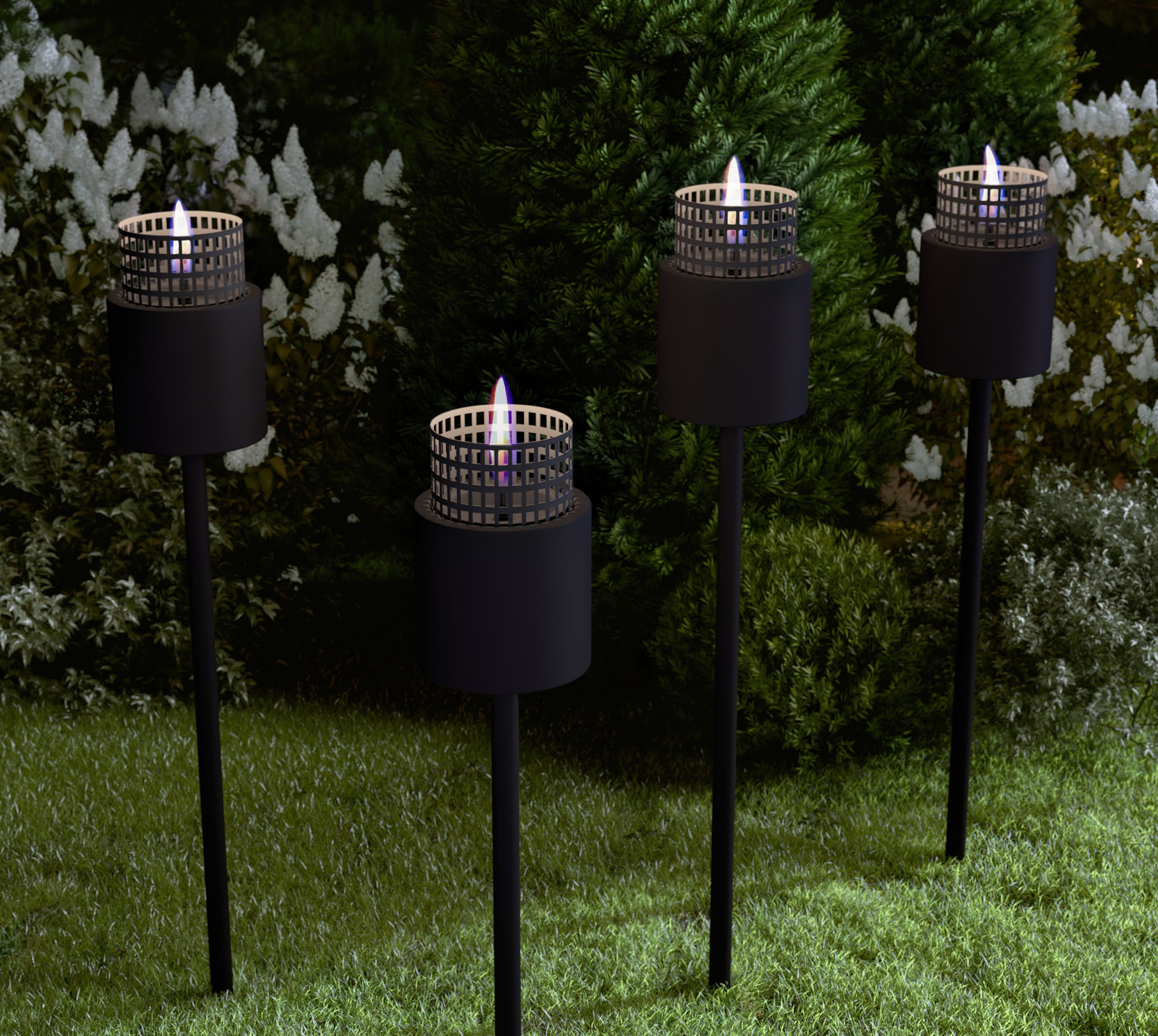 En fakkel skaper hyggelig stemming i hagen eller på verandaen året rundt. Kan også brukes inne. Uten os, sot, røyk og lukt. Designer: Halvor Bakke