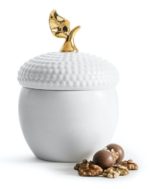 Skålen er laget av hvitt keramikk og er formet som en eikenøtt …