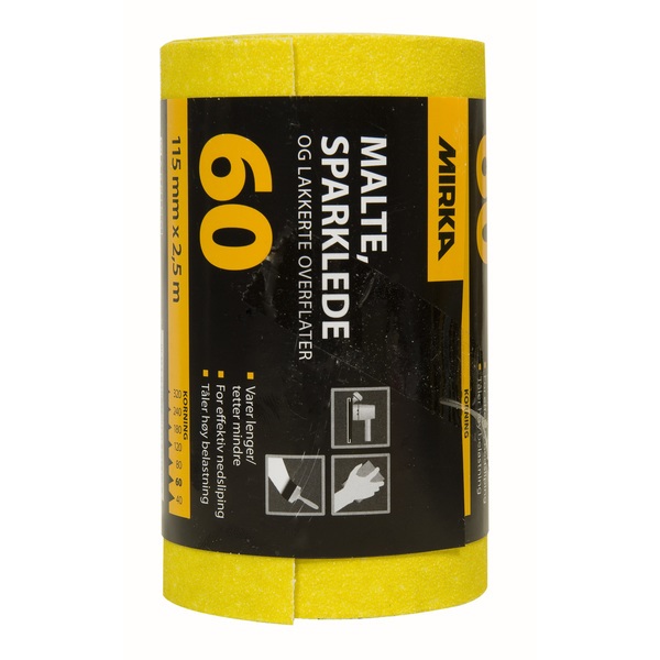 Mirka sandpapir med stearatbelegg som motvirker gjengroing ved sliping på lakk og maling. For effektiv nedslipning og tåler høy belastning. Mål: 115 mm x 2,5 m