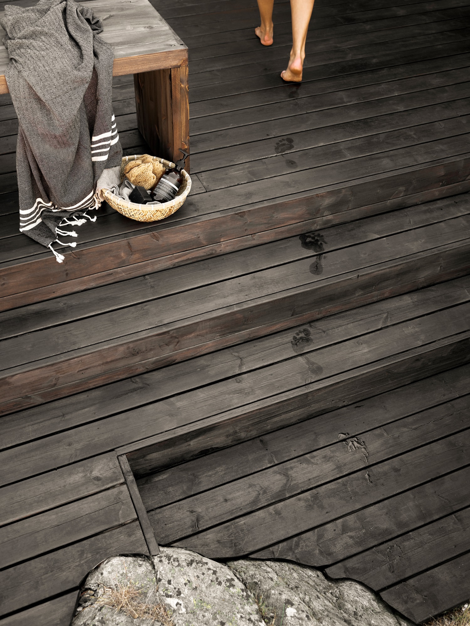 Noen timers arbeid er alt som trengs for å med god samvittighet kunne slappe av i inntil tre år på den sesongklare terrassen. Gammel terrassebeis fjerner du enkelt med TREBITT Terrassebeisfjerner som både renser og lysner treverket. Påfør så ett strøk TREBITT Terrassebeis i ønsket farge. Dermed gjenstår kun å nyte sommeren!
