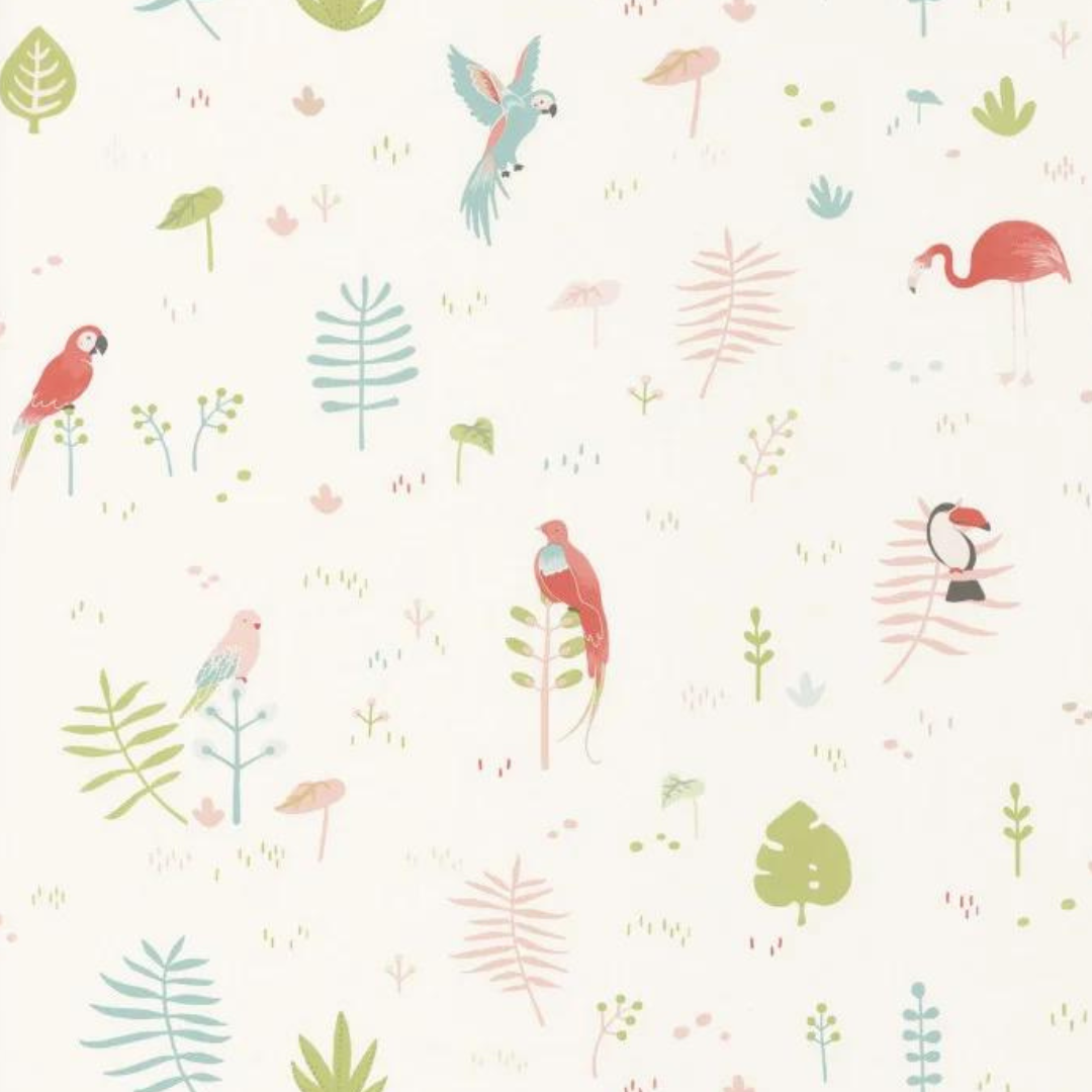 Papegøyer, flamingoer og andre eksotiske fugler har funnet sitt hjem på dette tapetet.
