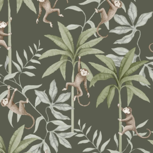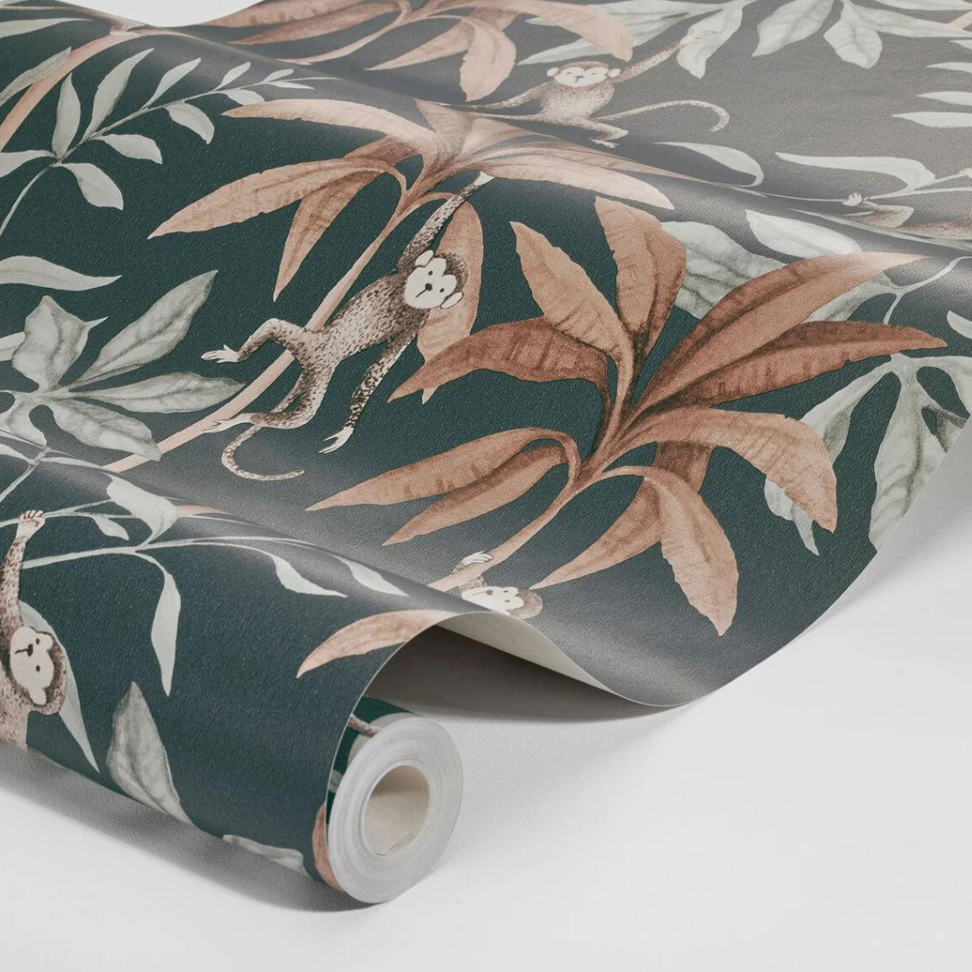 På det mørke barnetapetet Jungle Friends vokser det en stilisert jungel, full av livlige aper som klatrer i palmene og svinger seg i bladverket.