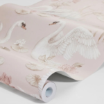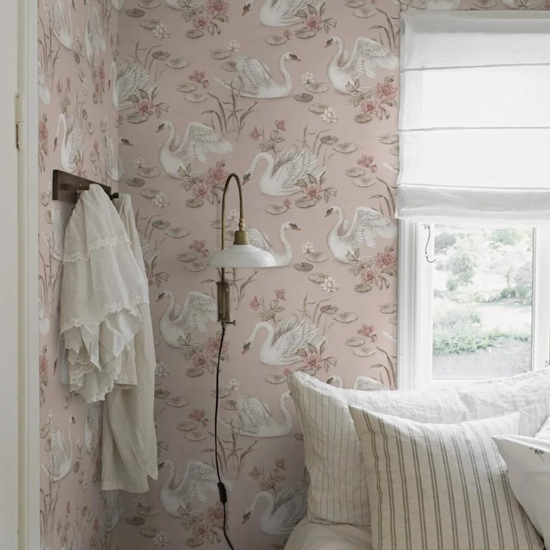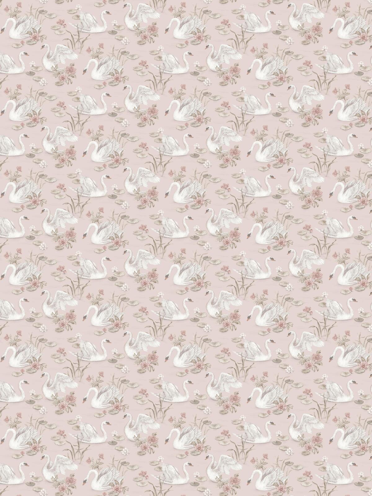 Her ser du tapetet Lily Swan i en vakker, rosa variant med hvite svaner og detaljer i lyserosa og brunt mot blekrosa bunn.