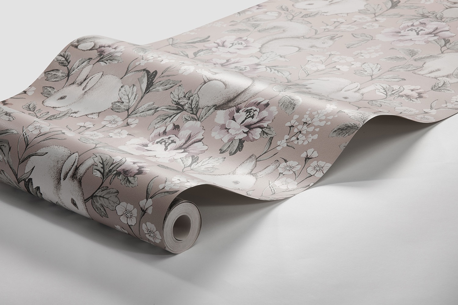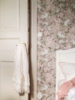 Her er tapetet med en varmt gammelrosa bunn og mønster i varme, milde toner av beige, brunt, grågrønt og rosa.