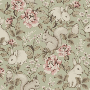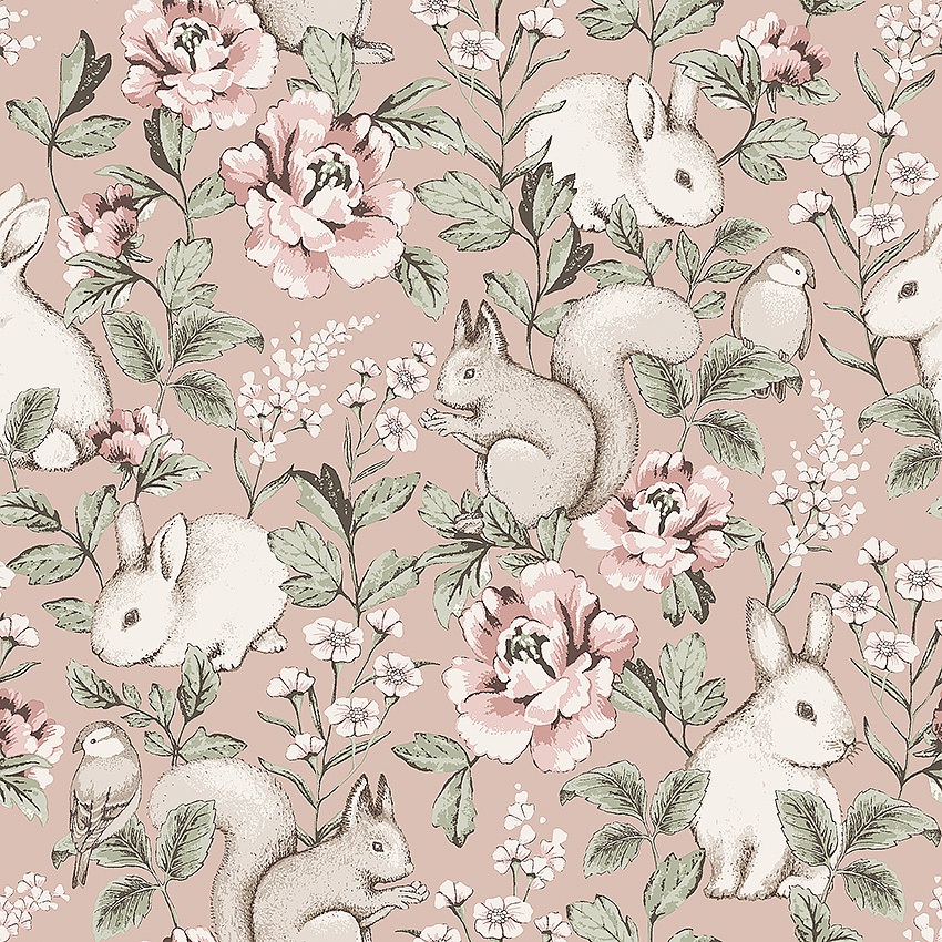 På barnetapetet Magic Forest ser vi søte ekorn, kaniner og spurver blant vakre blomster og grønne blader.