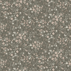 Her ser du mønsteret i mykt grønne, brune og gyllenbeige nyanser på varm hvit bunn.