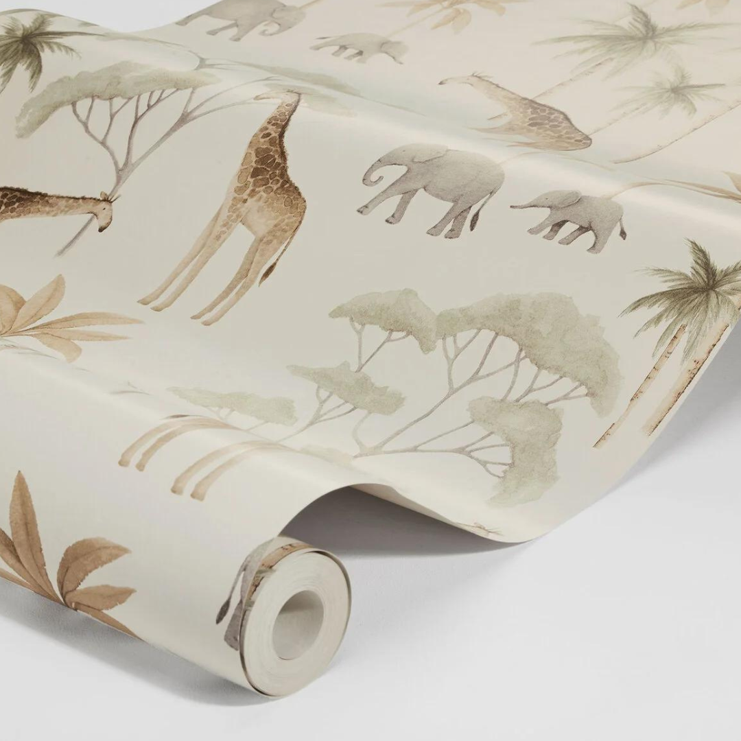 På det hvite barnetapetet Savannah ser du flotte sjiraffer strekke seg mot akasienes tretopper.
