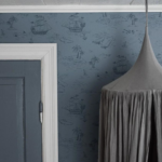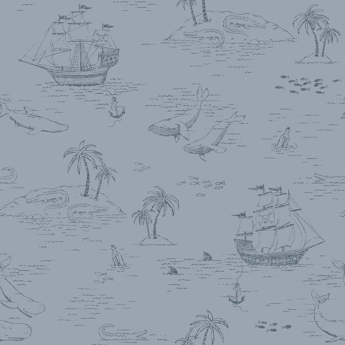 På det dempede gråblå barnetapetet Treasure Island svømmer det haier, hvaler og småfisk blant én og annen krokodille og sjørøver.