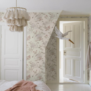 Her ser du det fine tapetet Lily Swan med detaljer i lyserosa og brunt på varmhvit bunn.