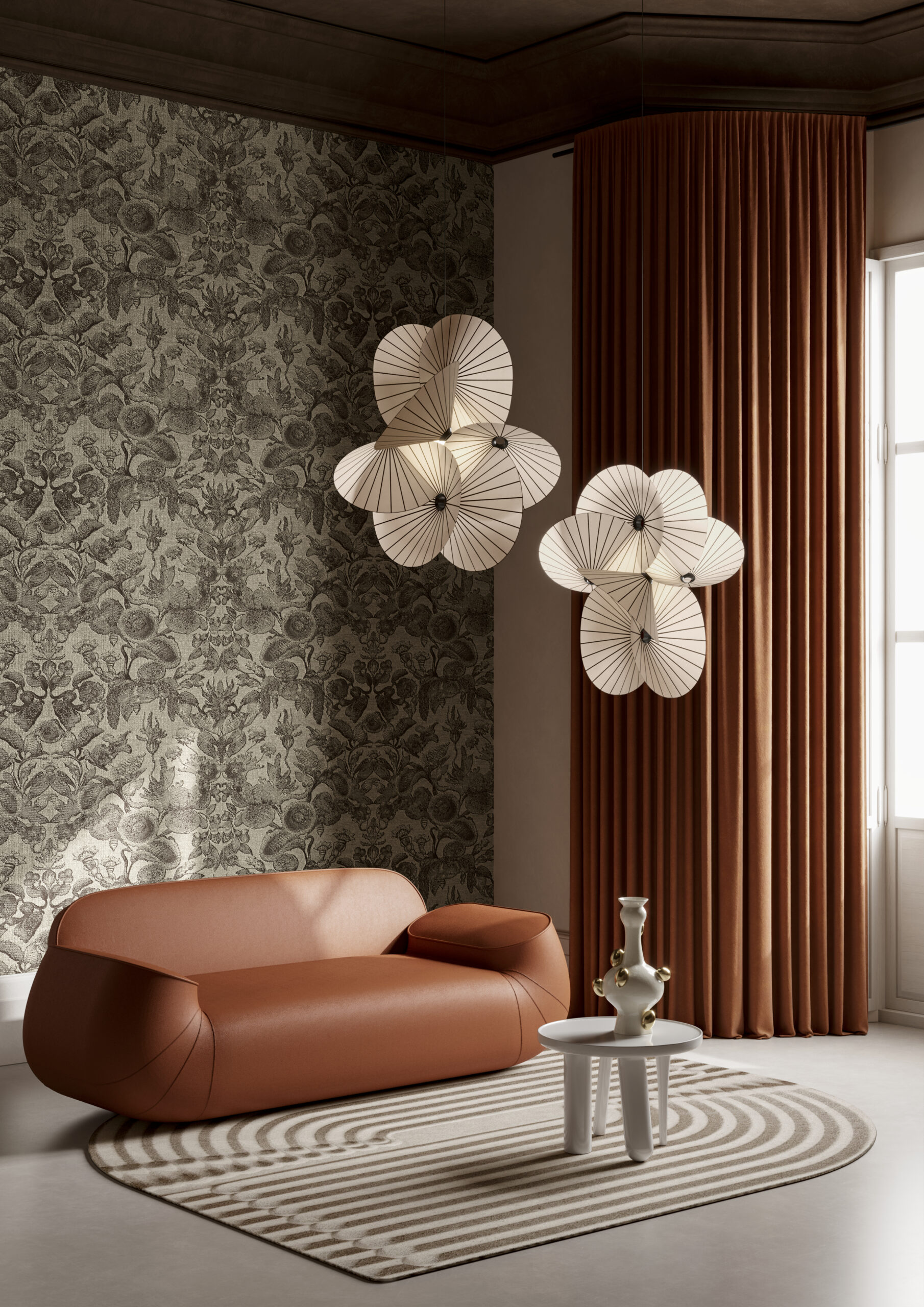 Tapetkolleksjonen coccinella bella fra Moooi er inspirert av det brede spekteret av blader og blomster og hinter til Jacobeansk stil.