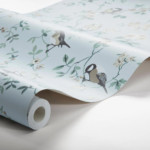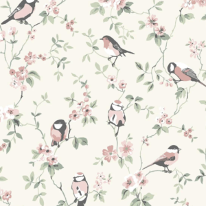 På det mønstrede tapetet Falsterbo Birds ser du søte kjøttmeiser og rødstruper mot en sart fond av blomstrende kvister.