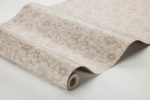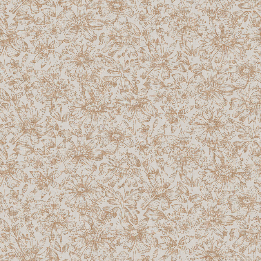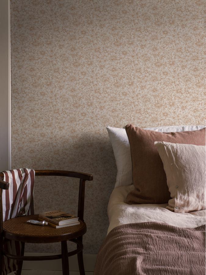 Her ser du det fine tapetet Lily Swan med detaljer i lyserosa og brunt på varmhvit bunn.