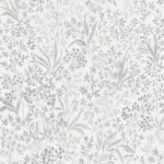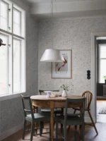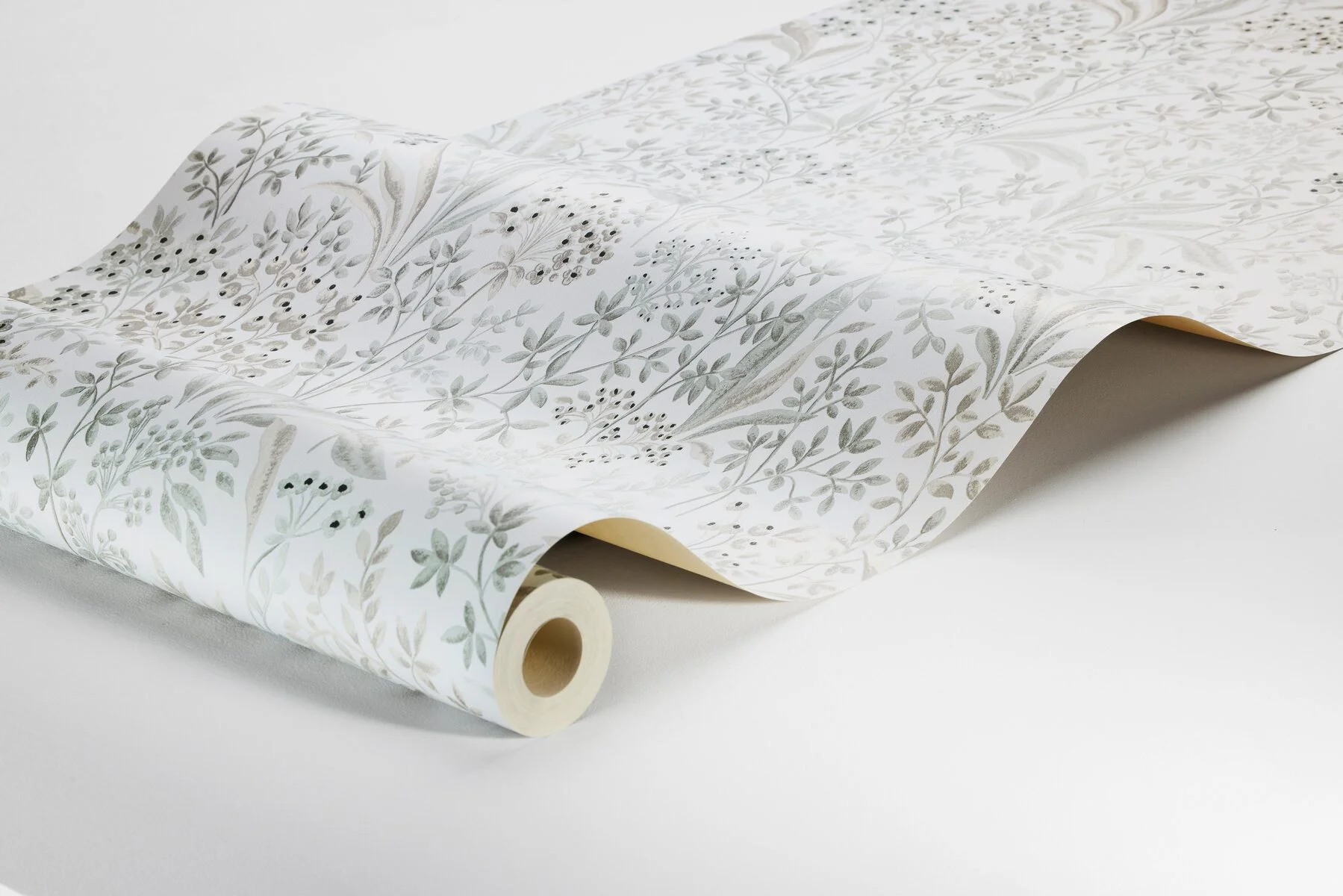 Det mønstrete tapetet Nocturne med tette, stiliserte bladverk med små blomster og frøstander føles både klassisk og moderne.