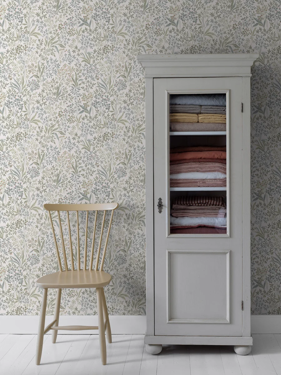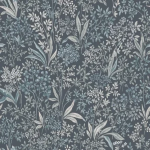Det mønstrete tapetet Nocturne med tette, stiliserte bladverk med små blomster og frøstander føles både klassisk og moderne.