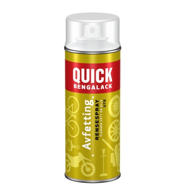 Quick Bengalack Avfetting spray er en spesialrens for fettholdige flater. Benyttes til rengjøring av metallflater (stål, aluminium og øvrig lettmetall), verktøy og motorer, samt rens av bremser, ski, sykkelkjeder og bilfelger. Produktet kan i tillegg benyttes til fjerning av rester av klistremerker, lim og stearin. Skader ikke lakkerte/malte flater. 400 ML.
