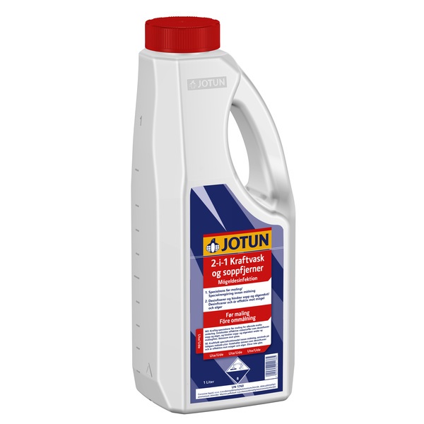 JOTUN 3-i-1 Kraftvask og soppfjerner – rengjør bedre. 3-i-1: Kraftvask eller husvask avhengig av blandingsforholdet, samt en desinfiserende effekt. Desinfiserer og gir en langtidsvirkende effket mot sopp og alger. Universal husvask og velikeholdsvask utendørs.