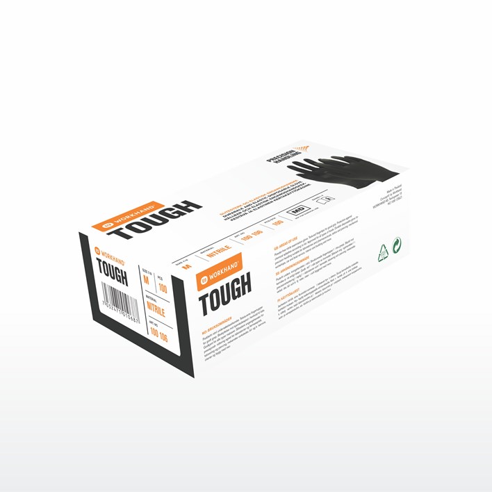 Pudderfri engangshanske i sort nitril. Forsterket utgave som tåler dieselolje og sitrusrens.